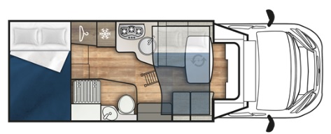 La prima grande differenza, a parità di lunghezza, è lo spazio abitabile a bordo. In un van il corridoio, il bagno, il blocco cucina e la zona giorno, sono decisamente più ridotte rispetto a un semintegrale (consideriamo solo queste due categorie in quanto il mansardato differisce per lo spazio letto superiore, collocato sopra la cabina guida). Tanto per avere un idea, qui sotto ci sono 2 piante abitative: un Van e un Semintegrale scelti puramente a titolo dimostrativo: