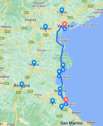 La Rotta del Sale è un itinerario che si snoda tra Venezia e la foce del fiume Po, tra città storiche e grandi riserve naturali per scoprire un territorio con importanti tradizioni culinarie e artistiche. Il percorso, complessivamente, ha una lunghezza inferiore a 250km. E’ l’ideale per un lungo fine settimana o una settimana di vacanza abbinando le mete a escursioni e città che si trovano a pochi km dai punti di interesse segnati sulla mappa.