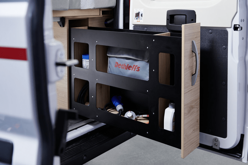 Anche il frigorifero è posizionato nella parte frontale del blocco cucina. Posizione molto insolita in un mezzo di 540 cm ma ha permesso di ricavare un piccolo armadio nella parte superiore. Interessante la dotazione del Pack Privilege Van che include: Tappezzeria dedicata, Fodere sedili cabina in tinta, Gradino di ingresso elettrico, Zanzariera sul portellone scorrevole, Retrocamera con monitor, Oscuranti plissettati in cabina e Luce esterna integrata nella grondaia (sopra il portellone scorrevole). Unico nel suo genere è invece il modello 60T perchè è l’unico van sul mercato ad offrire di serie il bagno con doccia separata. Lo spazio dedicato alla doccia, in modo molto ingegnoso, include anche l’armadio guardaroba.