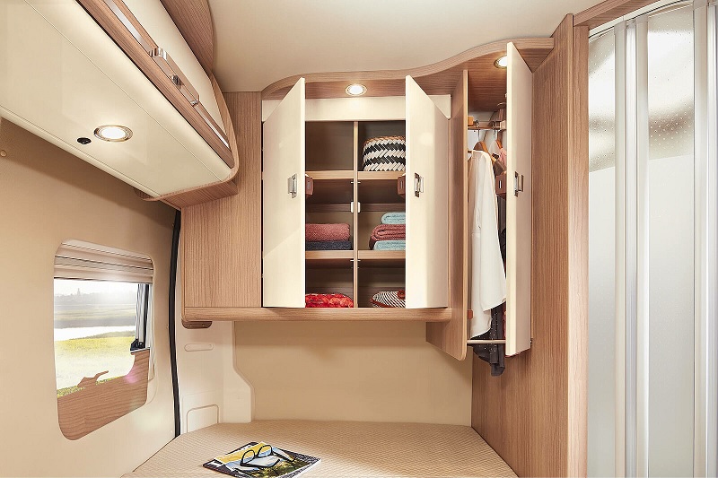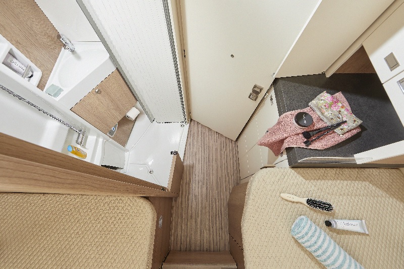 La porta che normalmente chiude il locale bagno, crea una separazione con la zona anteriore escludendo il blocco cucina e la dinette. Una paratia interna al bagno permette di isolare il piatto doccia dal resto dell’ambiente abitativo. Oltre a funzionare da zona per cambiarsi d’abito, si può sfruttare lo spazio di stivaggio e i ripiani d’appoggio per prepararsi nel modo migliore alla serata.