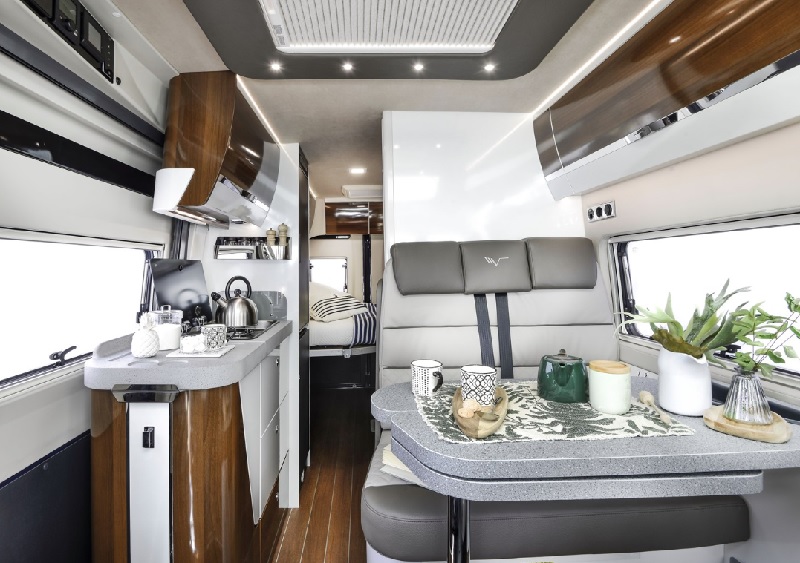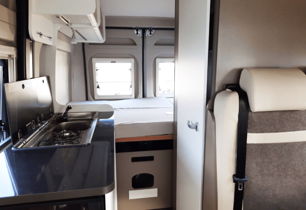 I volumi interni sembrano scolpiti nell’aria per dare consistenza alla materia e i dettagli riempiono questo volume con la sostanza di un van d’alta classe. Dal pavimento, alle tende, dall’illuminazione ai pensili, tutto è perfettamente coordinato e armonizzato per accogliere i viaggiatori che non badano a compromessi. E’ la fascia d’ingresso sul mercato di Malibu. I dettagli degni di nota non finiscono qui certamente, perchè se ci spostiamo nella zona notte, dove è presente il letto trasversale in coda, troviamo una soluzione per l’armadio guardaroba unica per eleganza e stile.