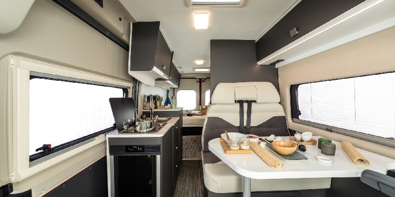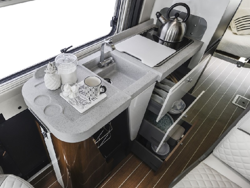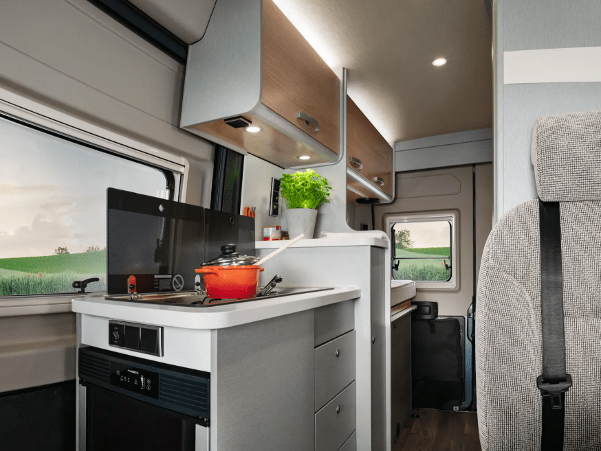Altro marchio storico produttore che nasce nel 1970 e oggi vanta uno stabilimento produttivo in Bavaria oltre ad altre unità produttive in Europa, oggi è un gruppo strutturato che mette a catalogo diverse tipologie di prodotto. Tra i marchi del gruppo ci interessa vedere cosa producono KNAUS e WEINSBERG Si può vedere al Padiglione 03 – Stand E 051. Per quanto riguarda i Van di casa Knaus possiamo scegliere tra le serie Boxlife, Boxlife Pro e Boxdrive. Ognuna delle quali declina in diversi modelli per dimensioni o versioni speciali. Partendo proprio dal più piccolo della famiglia, il Boxlife 540 MQ troviamo un allestimento alternativo del blocco cucina che prevede il frigorifero collocato sulla parte frontale del mobilio, sotto al piano cottura e un elegante lavello in acciaio inox incassato sotto al piano di lavoro con rubinetteria domestica.