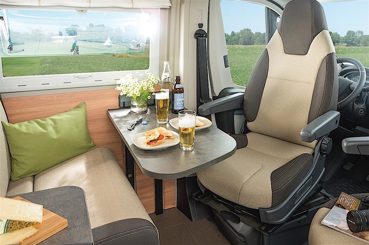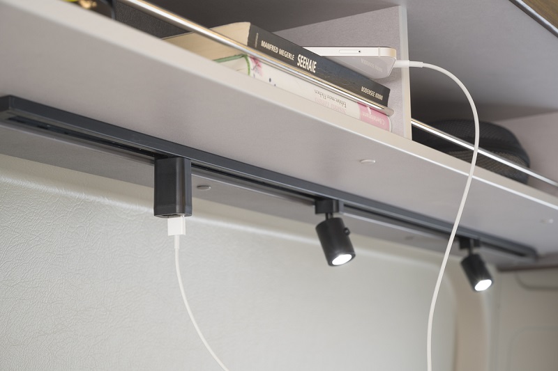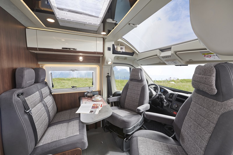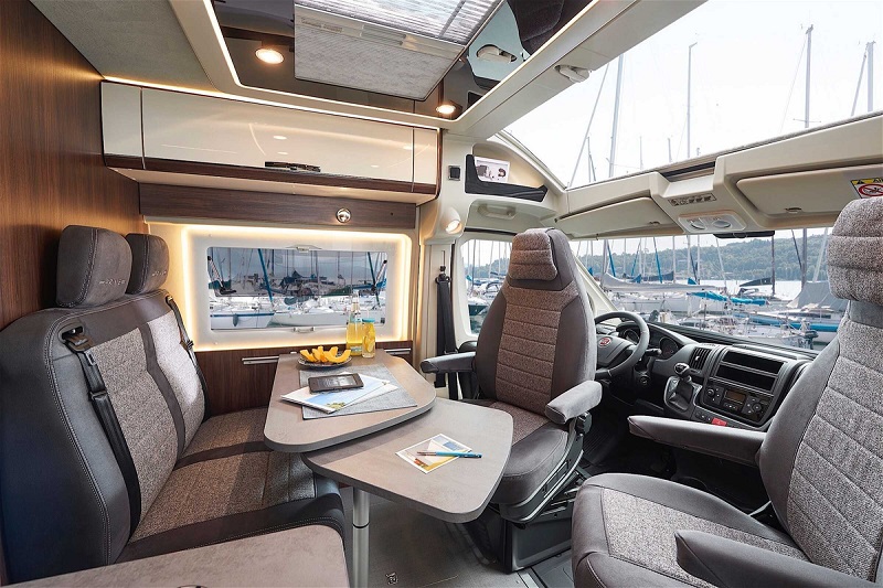 La passerella viene chiusa, in gran bellezza, dagli allestimenti Summit Shine che arricchiscono la dinette con configurazioni multiple e sedute di ispirazione automobilistico, una cappelliera apribile all’occorrenza, cornici alle finestre con illuminazione indiretta, nuovo binario elettrificato sotto ai pensili per decidere di posizionare liberamente faretti spot e prese USB.