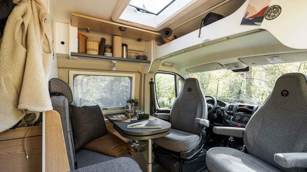 Questo punto di partenza è decisamente interessante, specie in un panorama dove il mercato dei 600 cm si attesta attorno ai 60.000 Euro e da qui a salire. Certo, un prezzo così competitivo ha un suo perchè ed è tutto nella dotazione. Che sia un Boxer, un Jumper o un Ducato possiamo affermare che si tratti, in buona sostanza, dello stesso mezzo per la gran parte dei componenti, specie se parliamo di meccanica. Le prime differenze le troviamo in cabina di guida, dove ad esempio notiamo la mancanza dei comandi audio al volante, così come manca il volante e la leva del cambio rifiniti in pelle e certamente non è dotato di ADAS o di luci diurne a led. C’è però il cruise control, una presa USB, i sedili rivestiti con lo stesso tessuto della panca fronte marcia e in tono con il resto dell’arredo e il serbatoio del carburante è da 90 Lt. In cabina c’è dunque l’essenziale: predisposizione audio con antenna DAB nello specchietto (non sul tetto), regolazione e sbrinamento elettrico degli specchietti, aria condizionata manuale, airbag conducente e passeggero, alza cristalli elettrici. L’essenziale per guidare in totale comfort. Non sono previste ulteriori motorizzazioni o miglioramenti all’elettronica al momento. Il telaio è da 3,5 T Light e non è prevista la versione Heavy o la doppia balestra all’asse posteriore. Per oscurare i vetri in cabina è prevista una tenda in tessuto, diversamente è possibile aggiungere gli oscuranti plissettati al costo di 705,00 Euro.