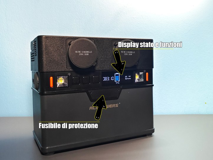 A completare il pacchetto di questa Allpowers S300, come su tutti i prodotti di questa azienda, troviamo un intero sistema di controlli elettrici (porta fusibile nella parte anteriore) ed elettronici, che servono ad evitare qualsiasi tipo di problema alla power station, ma soprattutto ai dispositivi ad essa collegati. All’interno di S300 trovano spazio diversi componenti, oltre alla batteria al litio c’è il regolatore di carica per il fotovoltaico e un BMS che integra funzioni di protezione da cortocircuito, sovraccarico, scarica eccessiva, surriscaldamento, bassa tensione e altre funzioni di protezione.