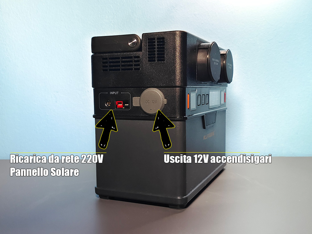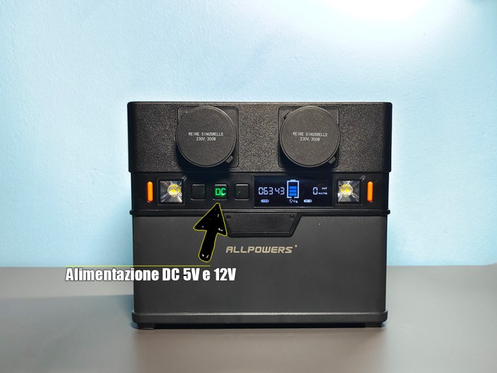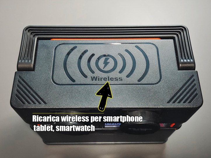 Nella parte anteriore di questa power station ci sono 2 utili lampade led che si possono accendere in modo indipendente e che, in caso di necessità o estrema emergenza, possono davvero fare la differenza. Sono fisse, non orientabili e non estraibili, ma possiamo sempre spostare la power station nel punto in cui serve. Le utility di questa power station si estendono nella parte superiore del corpo con una placca per la ricarica ad induzione: tipicamente ad uso degli smartphone ma è possibile ricaricare anche smartwatch e qualsiasi dispositivo con ricarica a induzione. Certamente meno comuni sono invece le 2 uscite DC 12V 5.5 mm X 2.5 mm – quelle che io comunemente chiamo 5525, 5520 o 1250 e via discorrendo in base alle dimensioni del connettore. Nel video di presentazione e descrizione spiego meglio cosa intendo dire: