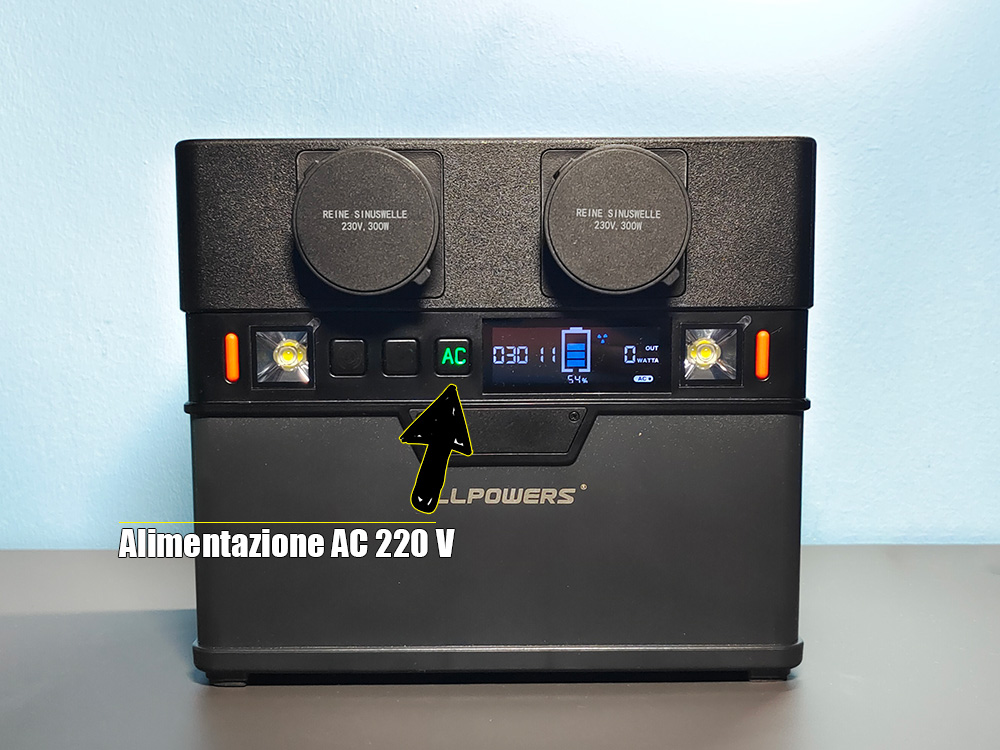 Il cuore di Allpowers S300 è una batteria al litio da 78.000 mAh in grado di erogare 300 W con un picco massimo di 500 W e complessivamente 288 Wh. La distribuzione della corrente è suddivisa tra AC (corrente alternata) a 220 V su due prese schuko e DC (corrente continua) variabile tra 5V e 12V su diverse tipologie di prese. Non è certo capace di alimentare grandi elettrodomestici, ma trova il suo potenziale nell’uso quotidiano in supporto ad esempio agli strumenti elettronici (smartphone, tablet, computer, lampade, piccoli elettrodomestici, …). E’ possibile ricaricare la sua batteria interna attraverso la comune rete elettrica di casa a 220V, pannello solare, porta USB-C o cavo accendisigari in camper / auto.