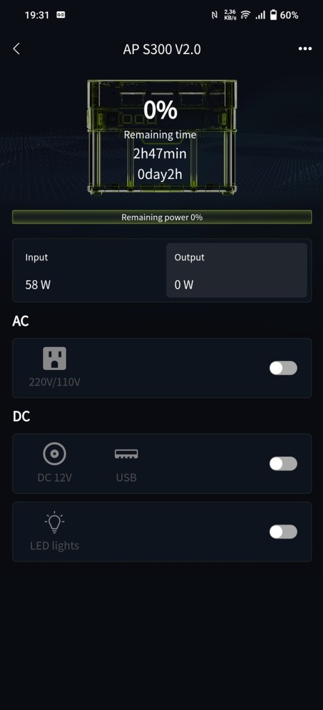 Un vantaggio molto interessante di questo modello è rappresentato dall’ app, disponibile per ambiente Android e iOS, che ti permette di controllare lo stato di carica della power station ma soprattutto, permette di accendere e spegnere le diverse uscite disponibili. In questo modo, se abbiamo collegato alla nostra S300 un apparecchio elettrico possiamo accenderlo e spegnerlo comodamente dal telefono.