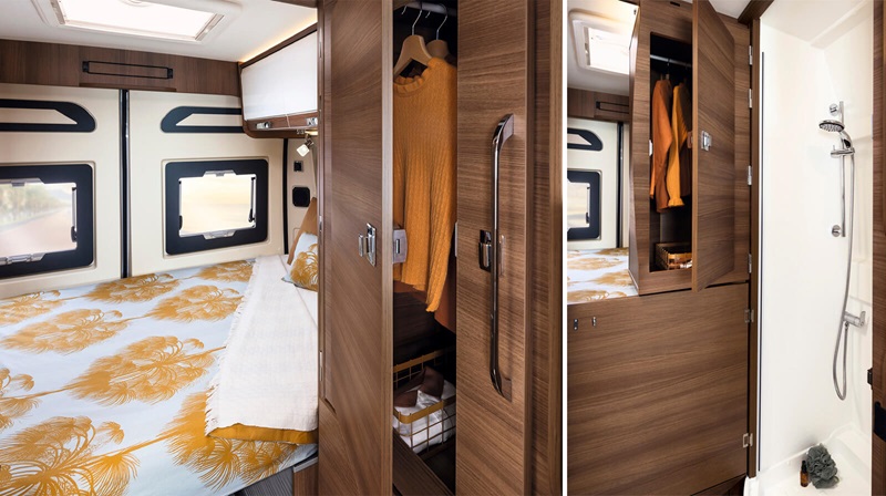 In questo modello, Rapido ha scelto di dividere il locale bagno composto dal WC chimico a cassetta, lavabo e spazi di stivaggio, dal locale doccia, ricavando un vero e proprio box in cui è possibile lavarsi, ma non solo. Se pensiamo al volume interno di un locale, in questo caso proprio del box doccia, ci rendiamo conto come questo non sia sfruttato nella maggior parte del tempo. Qui entra in campo la sapiente arte del progettare un van: la parte superiore del box doccia ospita l’armadio guardaroba per i capi appesi. Sfruttando così il volume normalmente inutilizzato si è reso possibile compiere un vero e proprio miracolo di sfruttamento dello spazio. Questo ingegnoso sistema ci permette di estrarre il blocco armadio facendolo ruotare verso la zona letto, ottenendo così tutto lo spazio necessario per fare la doccia. Il sistema del piatto doccia, denominato MODULSPACE (r), ha permesso di ricavare il lato anteriore stondato, così da aumentare lo spazio e facilitare le operazioni durante la doccia.