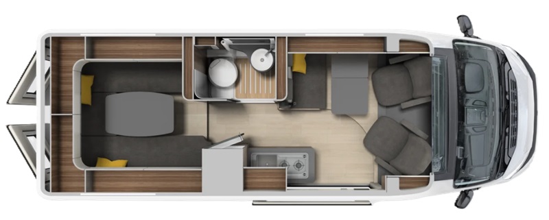 In modalità notte, ovvero con i letti pronti nella zona posteriore, gli occupanti del van potranno comunque utilizzare la semi dinette anteriore, formata dai due sedili anteriori girevoli e dalla panchetta fronte marcia. Al centro è previsto un piccolo tavolo a ribalta che consente comodamente di fare colazione o consumare un pasto al volo.