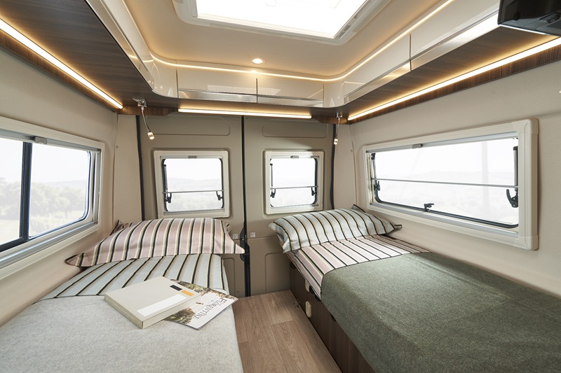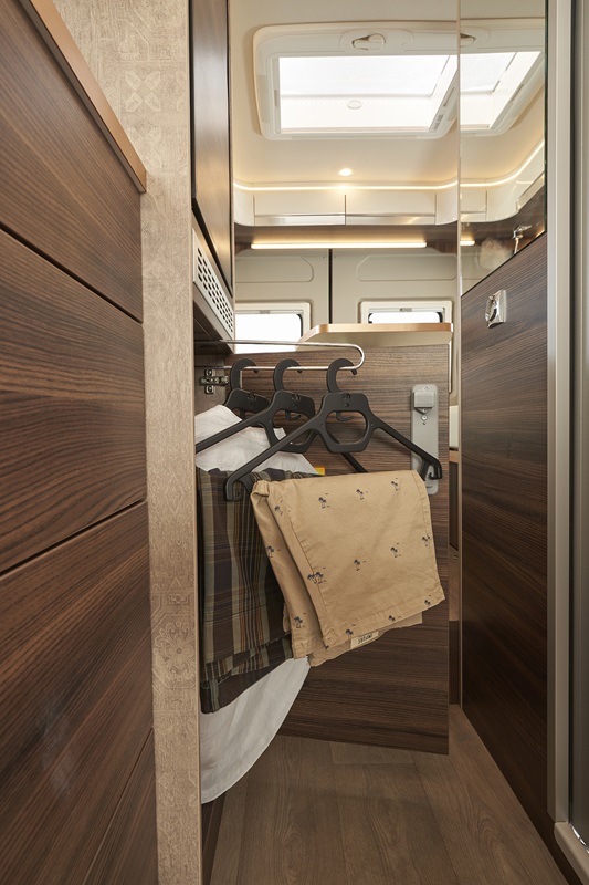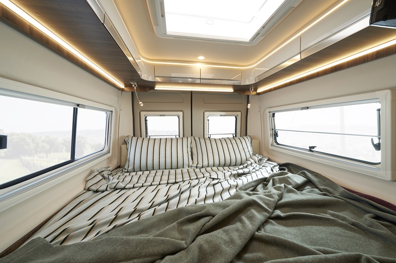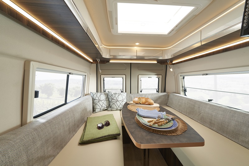 Nessun elemento o componente della zona abitativa viene sottovalutato: il cielo è rivestito da un morbido e soffice materiale tessile, così come le pareti e l’effetto soft touch è garantito. Tutti gli elementi del mobilio sono dotati di pareti anticondensa ed elementi che favoriscono il corretto ricircolo dell’aria. In dinette ritroviamo il doppio pavimento con elementi di stivaggio e illuminazione indiretta, così come la ritroviamo nella parte superiore del volume abitativo. La luce artificiale gioca un ruolo fondamentale quando fuori cala il buio: elementi di comfort per non creare zone d’ombra o zone di luce ad alta intensità. L’illuminazione è dimmerabile (intensità regolabile) così da trovare la miglior configurazione per ogni situazione.