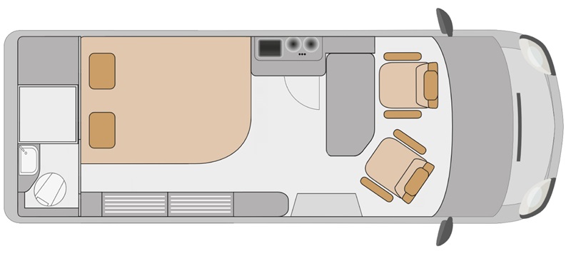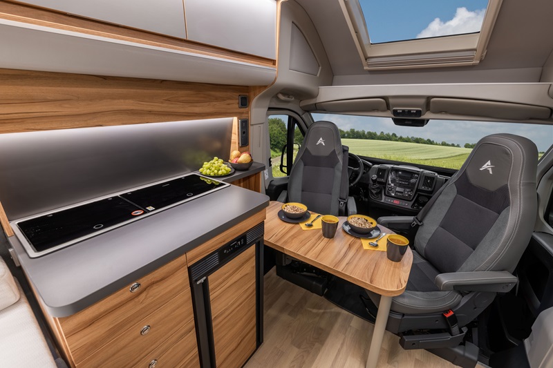La presentazione della collezione parte proprio da questo modello, oggetto d’esame di questo articolo, che rappresenta la chiave di ingresso all’esclusività Affinity. Modello proposto, nell’ormai già citata, meccanica Fiat Ducato, è omologato unicamente per 2 persone: sia in viaggio che a letto. Un dato importante per comprendere la pianta abitativa che si apre sulla semi dinette con un piccolo tavolo, abbattibile all’occorrenza, che offre spazio sufficiente per i due viaggiatori.