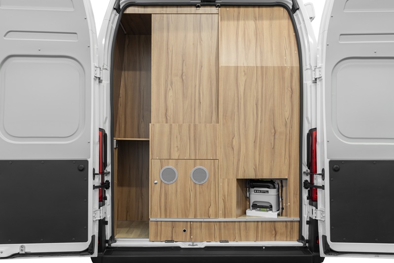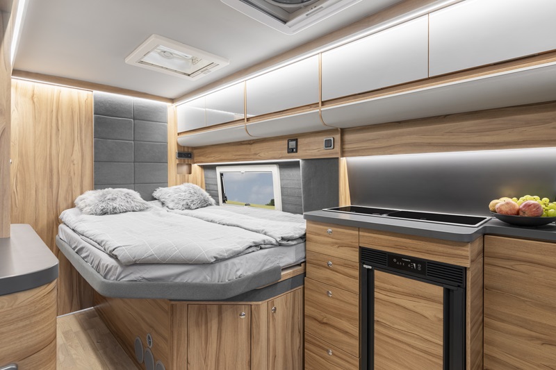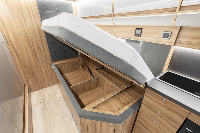 Ciò non solo aumenta considerevolmente lo spazio a disposizione ma lo rende più sfruttabile, rispetto ad esempio, ad un unico spazio di stivaggio posizionato sotto al letto, tipico dei van comuni. Il letto poggia quindi solidamente su una struttura rigida, supportato dalle reti a doghe, mentre per completare lo sfruttamento dello spazio, alcuni impianti sono stati collocati proprio sotto al letto.
