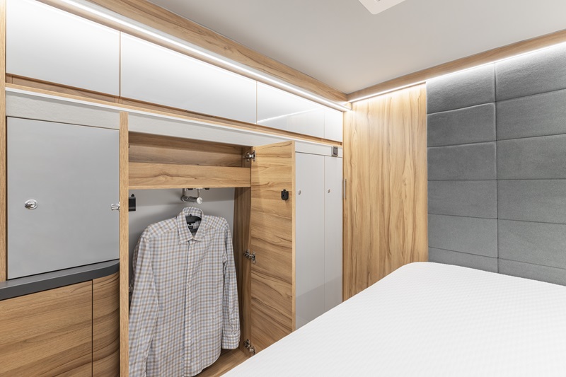 Lungo le fiancate sono disposte file di pensili pronte ad accogliere tutto il necessario per il viaggio e, a ridosso del letto, sulla fiancata destra (rispetto al senso di marcia), si trovano una serie di pannelli che richiamano l’idea di un grande armadio tipico degli appartamenti. Qui sapientemente organizzati, ci sono gli spazi necessari per i capi appesi e altro abbigliamento piegato. La fila di pensili prosegue anche su questo lato.