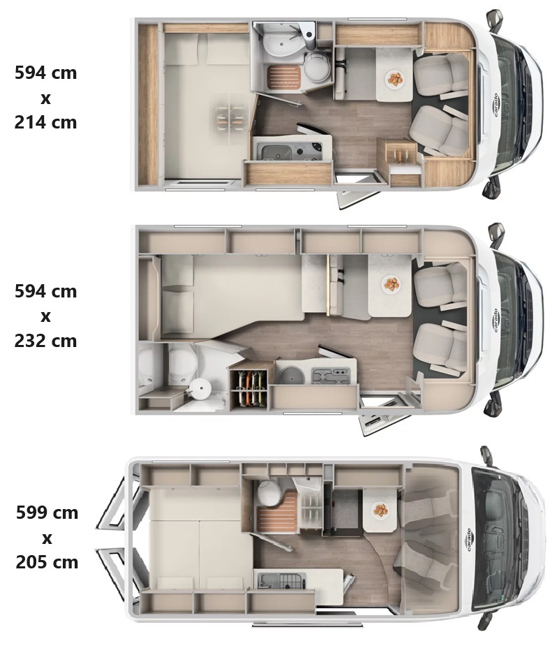 Anche sulla lunghezza complessiva del veicolo si è lavorato molto per proporre misure del tutto simili a quelle di un Van di taglia media. Partiamo proprio dalla misura standard per un Van proposto nella sua variante da 599 cm; troviamo Semintegrali di medesima lunghezza con la disposizione degli elementi abitativi interni simili a un Van. Il letto è sempre in zona posteriore e trasversale al senso di marcia – ma troviamo anche alcune soluzioni originali che ho presentato nei miei video sul canale YouTube – il blocco cucina completo di frigorifero fronteggiato dal blocco bagno con doccia integrata e la semi dinette anteriore con panchetta fronte marcia e sedili anteriori girevoli.