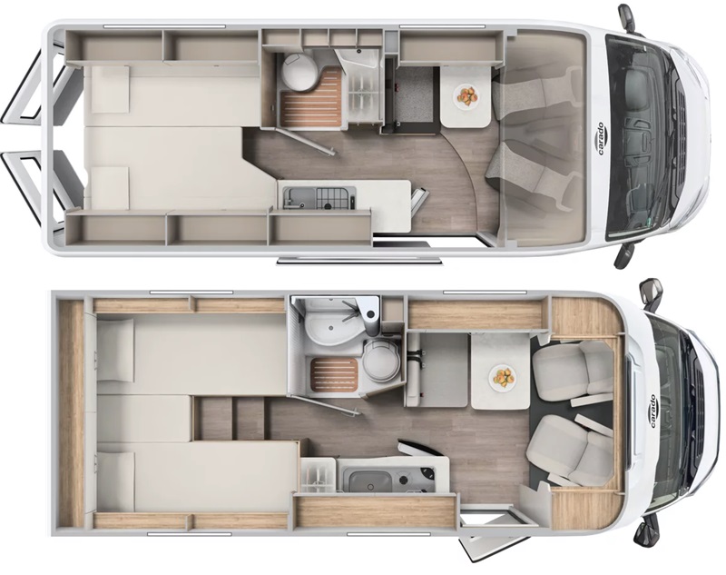 Passando ai Van da 636 cm possiamo trovare analoghi veicoli in questo segmento dove l’unica differenza sostanziale è il letto posteriore che diventa longitudinale al senso di marcia e si acquistano cm preziosi sia in lunghezza che in larghezza. Due letti singoli che all’occorrenza possono essere uniti per i 2/3 della lunghezza. Data la conformità del letto, in questi casi potremmo trovare alcuni spazi di stivaggio extra sollevando le doghe dei letto o addirittura potremmo trovare capienti armadi guardaroba.