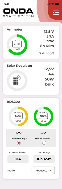 Il Battery Duo System-200 è un dispositivo in grado di gestire in modo intelligente due batterie di servizio a 12 volt, sia in fase di carica che in fase di scarica. Grazie al BDS200 è possibile collegare due batterie di capacità ed età diverse. Controllando continuamente la funzionalità di ogni singola batteria, in caso di problema a uno degli accumulatori questo viene automaticamente isolato. Il sistema è compatibile con lo standard di comunicazione CL-BUS per una perfetta integrazione con gli altri sistemi di bordo. Utilizzabile con batterie al litio e al piombo (ad acido libero, gel o AGM), gestisce una corrente massima di 200 ampere (100A per canale) e calcola automaticamente l’autonomia residua e il livello di carica, verificando lo stato di salute dell’accumulatore. Il tutto è visualizzabile, grazie al collegamento Bluetooth, sull’app Onda Smart System. Il Battery Duo System-200 è un dispositivo in grado di gestire in modo intelligente due batterie di servizio a 12 volt, sia in fase di carica che in fase di scarica.