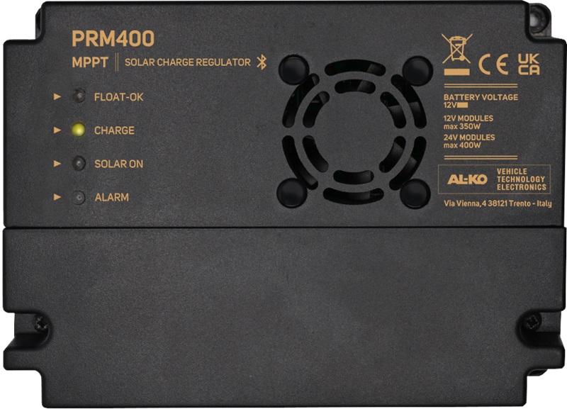 Con il modello PRM400, la gamma di regolatori solari con tecnologia MPPT (Maximum Power Point Tracker) di AL-KO Vehicle Technology Electronics arriva a gestire fino a 400 watt totali di potenza. Questo prodotto è in grado di caricare batterie al litio e al piombo (ad acido libero, gel o AGM) a 12 volt in modo automatico, controllando e limitando l’energia fornita dai moduli fotovoltaici collegati. La tecnologia MPPT gli consente di sfruttare in ogni situazione la massima potenza erogabile dal modulo fotovoltaico e massimizzare l’efficienza di carica (oltre il 20% in più rispetto alla tecnologia PWM). Oltre che sull’app, le informazioni sullo stato di funzionamento possono essere visualizzate su un pannello opzionale. Anche questo dispositivo integra la connettività CL-BUS. Con il modello PRM400, la gamma di regolatori solari con tecnologia MPPT di AL-KO Vehicle Technology Electronics arriva a gestire fino a 400 watt totali di potenza.