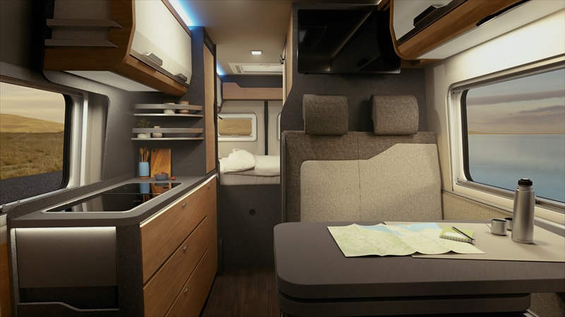Geometrie ed elementi funzionali che ben si sposano con gli accostamenti cromatici che giocano molto sui toni chiari dei pensili e gli elementi delle pareti soft-touch e vanno in contrasto con le essenze legno delle pareti e delle strutture dei mobili alti oppure con i frontali dei mobili bassi. Elementi funzionali anche per quanto riguarda le finestre dove sui portelloni posteriori le ritroviamo di dimensioni ridotte – rispetto al solito – e posizionate nella parte superiore. Ciò aumenta la sicurezza nella zona letto pur garantendo un buon flusso d’aria senza averla direttamente sulla faccia. L’illuminazione led adotta il collaudato schema composto da faretti e strisce indirette per creare ambienti dinamici e di comfort in ogni situazione.