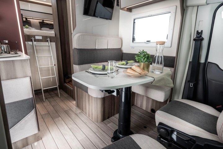 Allestito su meccanica Ford Transit 2.0 cc 130 CV con cambio manuale è lungo 599 cm e largo 215 cm. Ospita comodamente due persone adulte ma è possibile avere in opzione un letto singolo basculante che discende sopra la dinette. Dinette che ritroviamo in conformazione a L con una panchetta fronte marcia per due persone oltre a una penisola che costituisce il naturale prolungamento di uno dei posti a sedere. Si ricava così un tavolo di generose dimensioni, sorretto da una gamba telescopica. Il piano del tavolo traslabile permette di sedere comodamente in quattro. Se consideriamo la possibilità di trasformare la zona dinette in un letto singolo, in abbinata al letto basculante, si ottengono quattro posti letto, così quanti sono i posti viaggio.