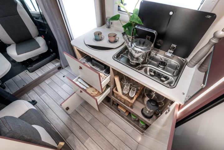 Il blocco cucina, in posizione standard, tra la porta d’ingresso e la zona letto è compatta ma non rinuncia a un lavello di forma circolare e separato dal piano cottura a due fuochi. Il coperchio del lavello può essere utilizzato come tagliere e questo costituisce l’unico ripiano d’appoggio perchè purtroppo non è previsto un ripiano a ribalta che estenderebbe la superficie di lavoro.