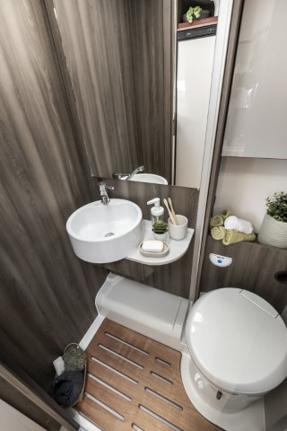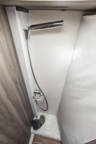 Il locale bagno sfrutta la parete girevole per ricavare preziosi centimetri destinati al box doccia con il suo miscelatore e doccino separato. Interessante la soluzione di adottare le stesse finiture materiche delle pareti in legno così da rendere un senso di continuità tra la zona giorno e il bagno. Pochi ripiani e armadietti di stivaggio, sufficienti per l’equipaggio di coppia.