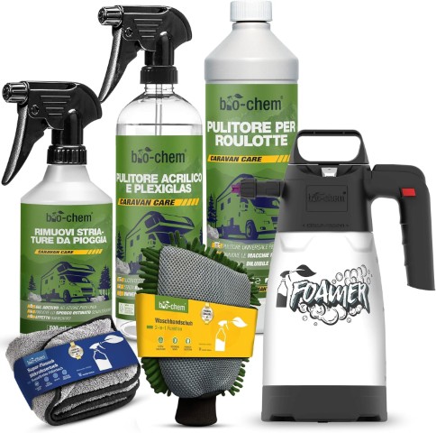 bio-chem – Profi Set 6 Prodotti per la Cura di Caravan e Camper – Pulizia delle superfici Esterne dei Veicoli da Campeggio – Cura di vetri, Parabrezza e carrozzeria – Accessori Inclusi