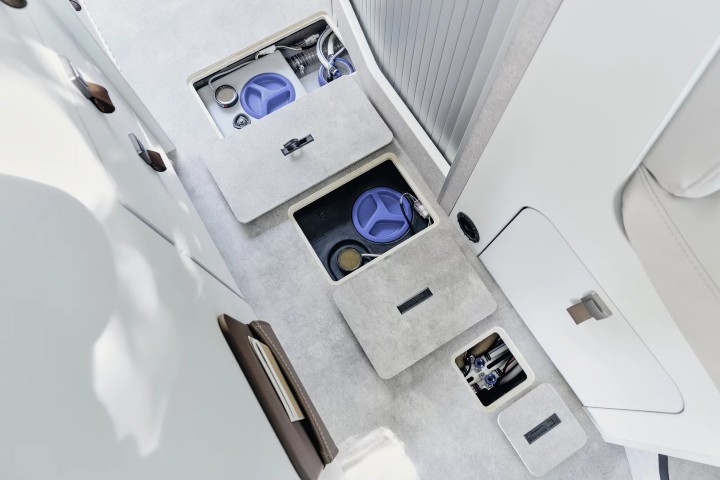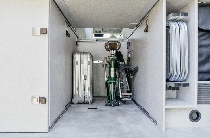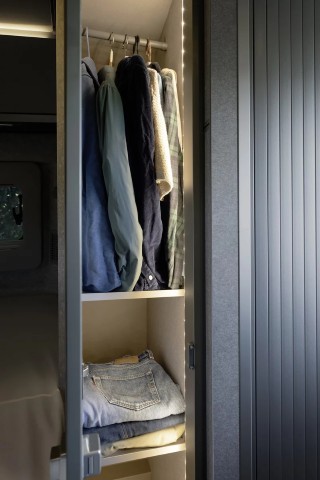 Grande capacità di stivaggio, nonostante alcuni pensili abbiano un volume ridotto, ma il vero punto di forza è tutto sotto al letto. Cassetti per l’abbigliamento, armadio per i capi appesi corti, spazio a giorno, armadietti con ripiani e un armadio a tutta altezza. Lo spazio sembra non finire mai ma ciò che interessa è la disposizione di questi spazi: sempre pronti e pratici da utilizzare. Nella parte posteriore, due nicchie permettono di alloggiare l’attrezzatura da campeggio o la scaletta per il tetto a soffietto. I serbatoi sono sotto pavimento, tutti isolati e riscaldati, così da non avere problemi neppure nella stagione invernale e sono facilmente ispezionabili grazie alle botole a pavimento che corrono lungo tutto il corridoio.